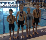 gold in both the 200 free relay and the 200 medley relay. Their amazing performances in the pool won them praise from other coaches on deck, in addition to the 10&U Age Group High Point Award for the meet, an honor for which they were able to coerce even Coach Jim to join them on the podium for pictures. And, to top an already awesome meet off, senior